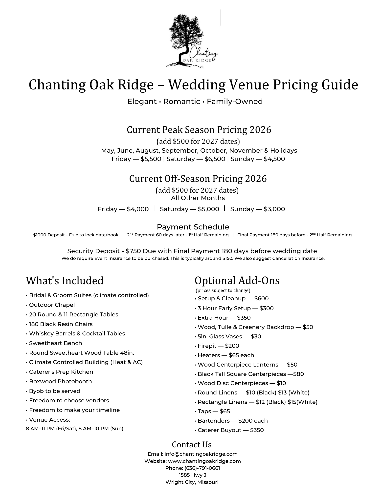 At Chanting Oak Ridge, we believe every couple deserves clarity, simplicity, and honest pricing. Our wedding packages are designed to give you flexibility while providing all the essentials needed for a seamless and beautiful celebration. Explore our seasonal rates, optional add-ons, and everything included to see how your perfect day can come to life at our venue.